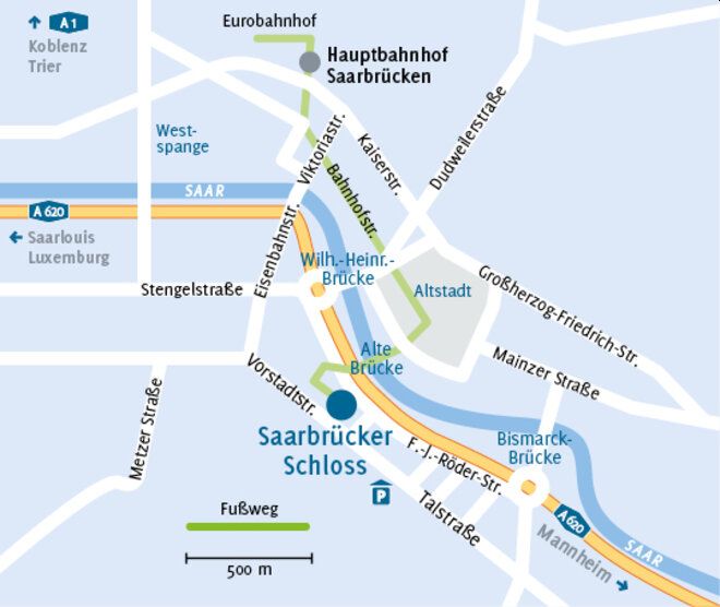 Das Saarbrücker Schloss thront auf einem natürlichen Sandsteinfelsen über der Saar. Auf ihn ist auch die Namensgebung der Stadt zurückzuführen: Sara Brocca von althochdeutsch brocc(h)o, abgebrochenes, der Brocken an der Saar. Das Saarbrücker Schloss war vom Barockbaumeister Friedrich Joachim Stengel als Zentrum des heutigen Altsaarbrücken angelegt. Die Achsen dieser ersten von Fürst Wilhelm Heinrich beauftragten Stadtplanung sind bis heute erhalten und deutlich sichtbar.